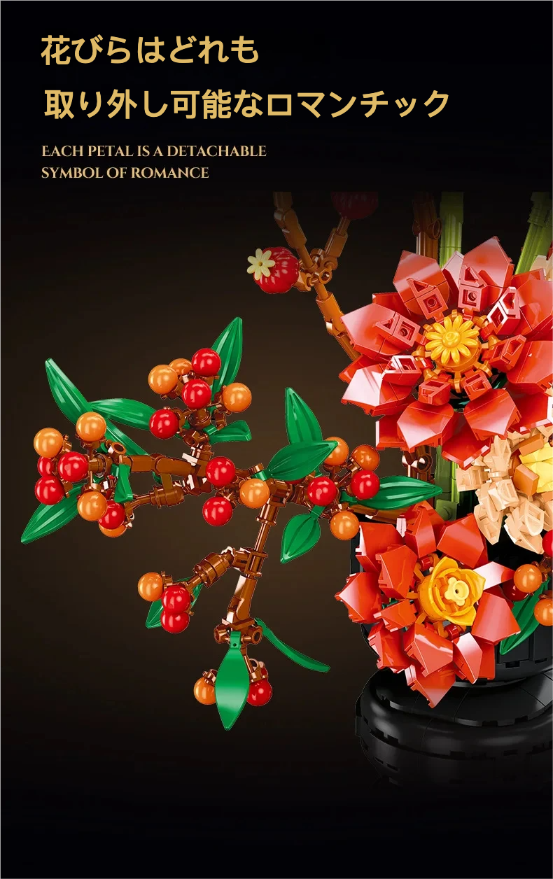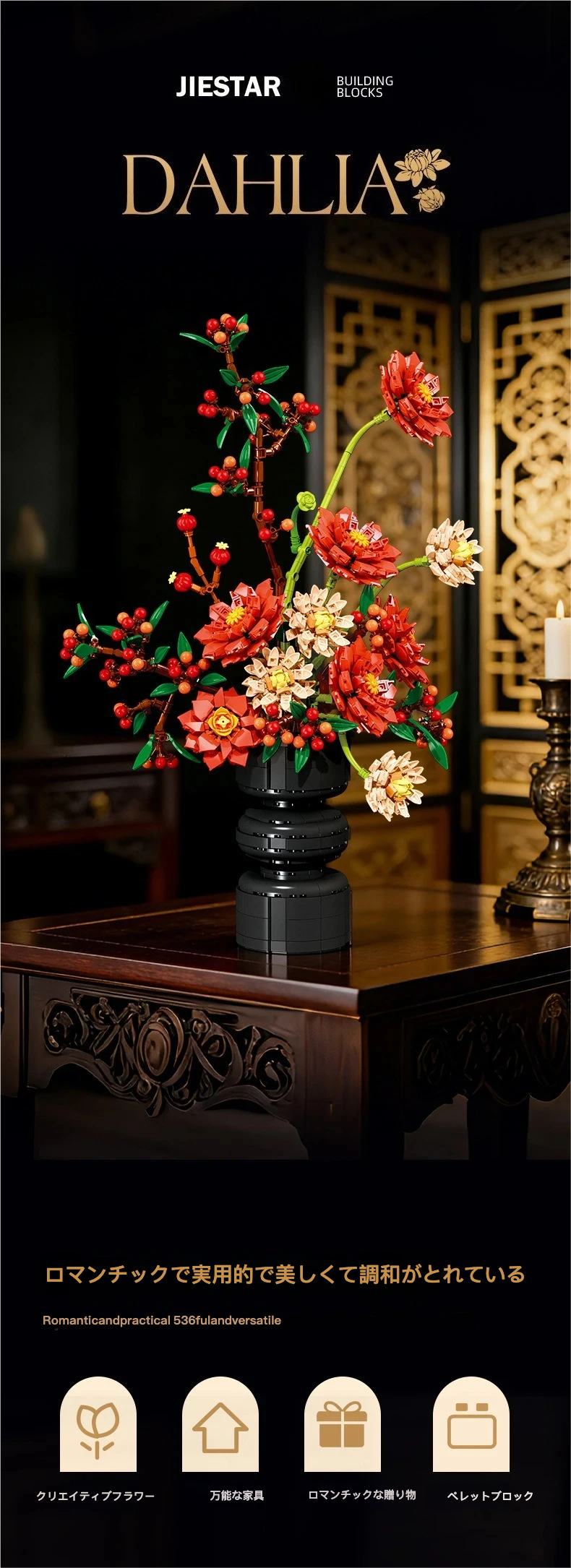 JJ9249は、精密なビルディングブロックで組み立てる、美しいダリアの花束です。枯れることのない永遠の花として、お部屋を華やかに彩ります。